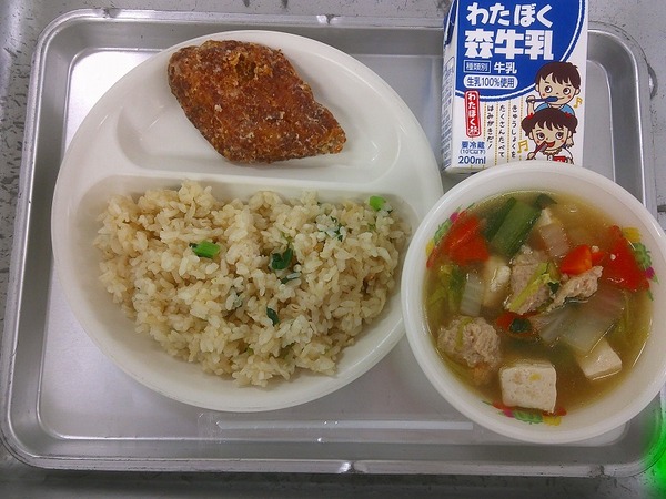 スープの肉団子は手作りです。大量のひき肉をこねて、一つずつ丸くしてスープに入れる作業はとても大変!それでも、子どもたちの笑顔を思うと、調理員さんたちは一生懸命手をかけてくれています。