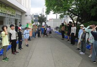 「あいさつ運動」ののぼりが立ち、さわやかな声が響いています。