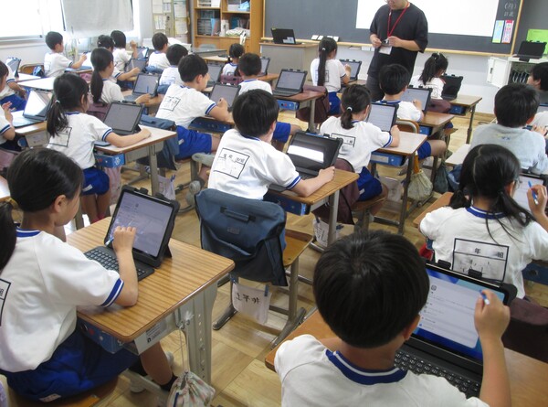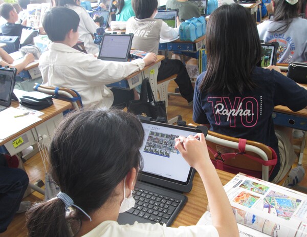 教室を回っていると、タブレットでとった写真をもとに、学校のお気に入りの場所を写生していたり、雲の動きを動画でとってみんなで見比べたり、繰り返し身に着けるためのドリルに取り組んだりと、様々な活用がされていました。