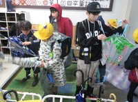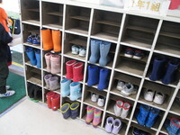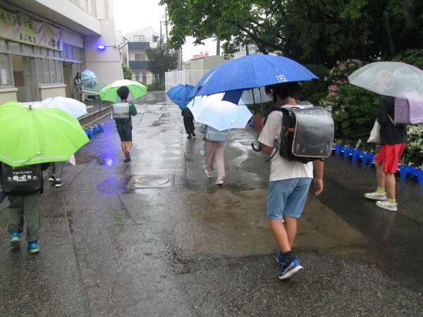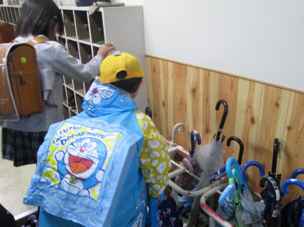 カッパに長靴スタイルの子どもも多く、廊下で荷物を広げて一生懸命畳んだりしまったりしていました。自分のことは自分でやろうと頑張る子どもたちです。