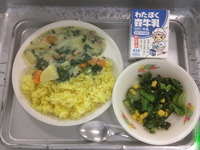 さいたまホワイトカレーには、岩槻区で生産されているヨーロッパ野菜「カリーノケール」を加えました。また、サラダに入った「小松菜」とカレーに入った「たまねぎ」は、緑区の若谷農園から納品してもらいました。産地が近いと良いことがいっぱい!おかげで給食もおいしく出来上がりましたよ。